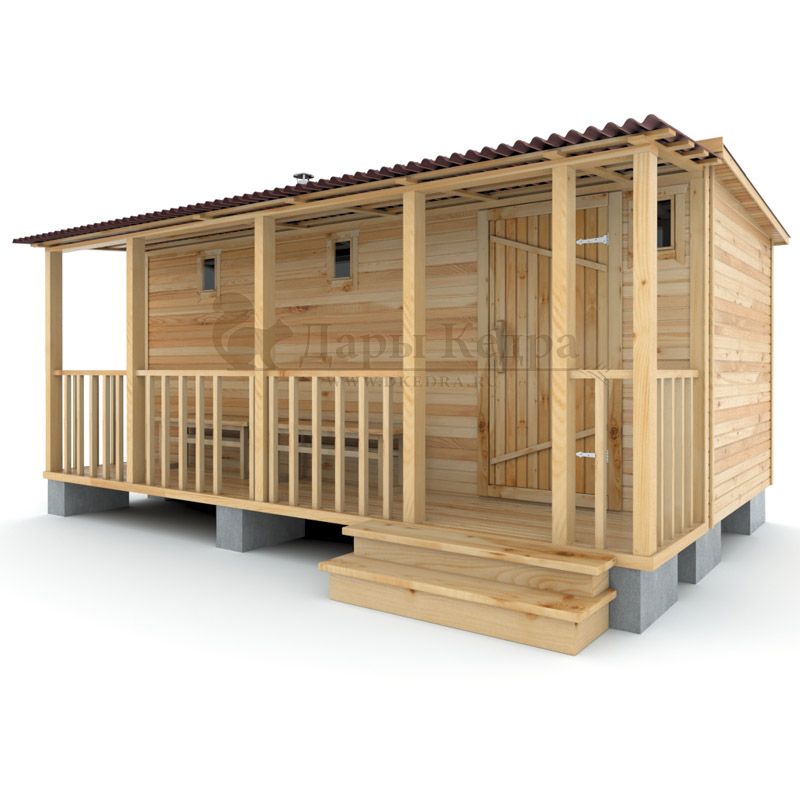 Каркасно-щитовая баня из кедра «Макси» с верандой Это классическая прямоугольная модель бани с тремя отделениями: предбанником, моечной и парилкой. Для удобства пользования предбанник оснащен лавочкой и вешалкой. В моечной находится лавка и полочка из кедра. Парилка оборудована двухуровневым открытым полком и печью. Время растопки такой бани не превышает 30 минут. На просторной веранде можно оставить вещи или отдохнуть после парения. Каркасно-щитовую баню можно заказать как в готовом, так и в разборном варианте. В разборной модели готовые щиты из кедра быстро собираются в полноценное строение, что также позволяет исключить лишний строительный мусор. Такая баня не требует полноценный фундамент, поэтому при необходимости ее можно перенести в другое место. Обращаем Ваше внимание, что в стандартную комплектацию бани входит полок открытого типа в парной. Дополнительно можно заказать полок закрытого типа или лавку! Древесина кедра насыщена эфирными маслами и фитонцидами, которые активируются при воздействии температур. Таким образом, парение в каркаско-щитовых банях из кедра становится еще полезнее.