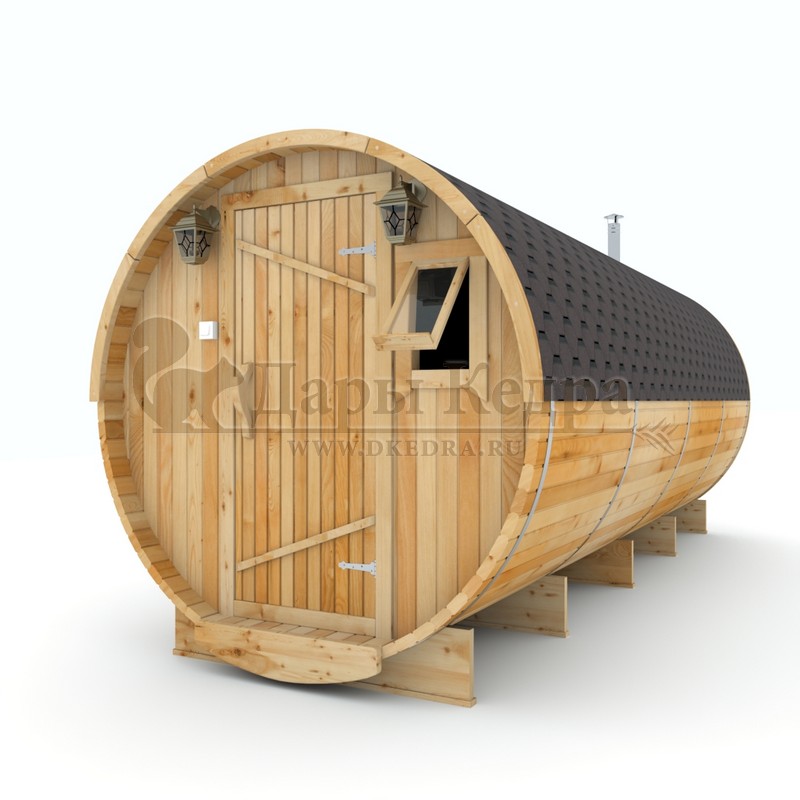 Баня-бочка круглая из кедра 6 метров Это изделие круглой вытянутой формы с тремя отделениями: раздевалкой, моечной и парной. Во всех трех отделениях с обеих сторон установлены лавочки из кедра. Печь находится в парилке около дальней стены. Для удобства пользования в бане висят полочки из кедра и вешалка в раздевалке. Время растопки такой бани не превышает 30 минут. По вашему желанию баню-бочку можно дополнить печью с внешней загрузкой, благодаря которой весь мусор после топки останется на улице. Круглая баня-бочка не требует полноценный фундамент, поэтому при необходимости ее можно перенести в другое место. Обращаем Ваше внимание, что в стандартную комплектацию бани входят лавки в парной с обеих сторон. Дополнительно можно заказать полок открытого или закрытого типа! Кедр обладает ароматическими свойствами. Он не деформируется и влагоустойчив, при правильном уходе за деревом на нем не развиваются грибки и плесень.