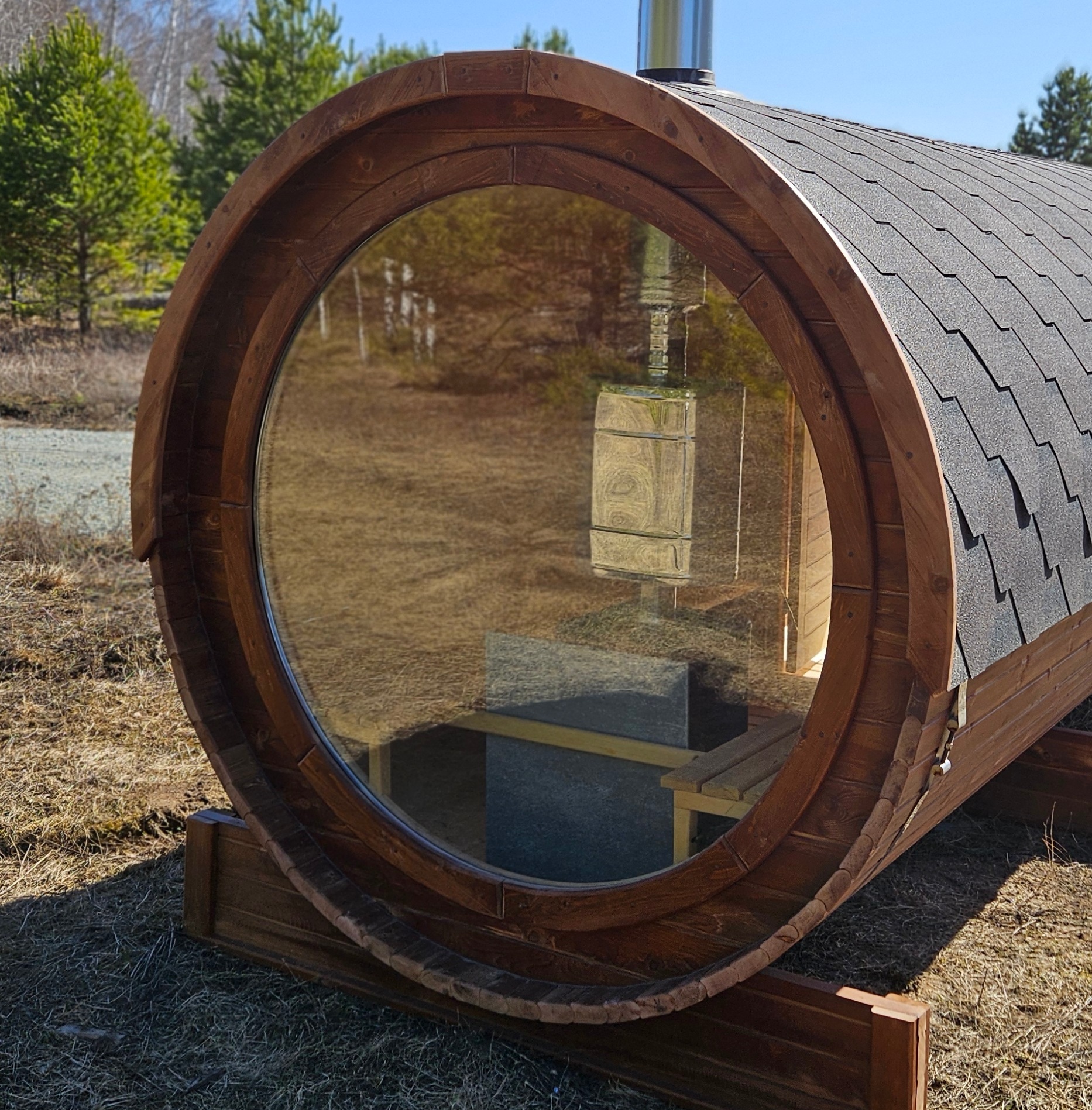 Это изделие круглой вытянутой формы с двумя отделениями: раздевалкой и парной. Лавочки из кедра находятся по всей длине бани-бочки с обеих сторон. Печь расположена в парилке около дальней стены. Для удобства пользования в раздевалке установлена вешалка и полочка из кедра. За счет небольшой конструкции баня нагревается не более 30 минут. По вашему желанию баню-бочку можно дополнить печью с внешней загрузкой, благодаря которой весь мусор после топки останется на улице. Круглая баня-бочка не требует полноценный фундамент, поэтому при необходимости ее можно перенести в другое место.