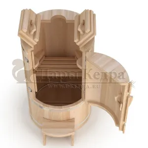 Круглая фитобочка из кедра - это мини парная, которую можно использовать не только в спа-салонах, но и дома. Такая модель наиболее компактна и мобильна. Толщина стенок составляет 40-45 мм, что позволяет увеличить срок службы изделия. Фитобочка оборудована откидными створками, дверцей и отверстием для головы. Во время парения человек сидит внутри кедровой бочки, а голова находится снаружи. Благодаря этому исключается возможность перегрева. Подлокотники из кедра, встроенные ручки на створках и двери делают эксплуатацию более удобной.