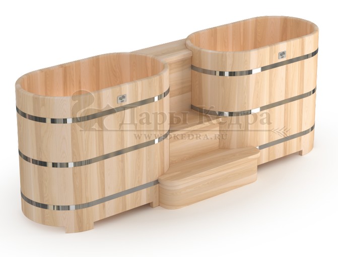 Двойная овальная купель для бани из кедра Двойная купель из кедра чаще всего используется в крупных банных комплексах и оздоровительных центрах. Она представляет собой две овальные чаши для воды, в которых люди отдыхают после парения. Между купелями установлен широкий подиум из кедра, по которому могут спускаться и подниматься сразу несколько людей. Для комфортного отдыха купель оснащена лавочками и двумя дополнительными лестницами. Обручи из нержавеющей стали декорируют изделие и равномерно распределяют нагрузку воды во время пользования. При правильном уходе купель для бани не рассыхается и не подвергается гниению. При взаимодействии древесины кедра с водой активируются эфирные масла и фитонциды, благодаря чему организм насыщается полезными веществами.