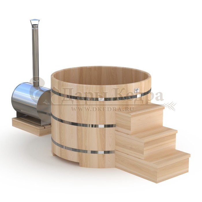 Фурако круглая из кедра с внешней печью Это уличная баня, которой можно пользоваться круглый год. Купель представляет собой круглую емкость для воды, внутри которой располагаются сиденья из кедра. Подогрев воды осуществляется приставной печью с дымоходом. Для удобства пользования японская баня фурако оборудована внешней и внутренней лестницей из кедра. Целебная древесина кедра богата фитонцидами и эфирными маслами, которые активируются при нагревании. Таким образом, во время процедур парения организм насыщается полезными веществами.
