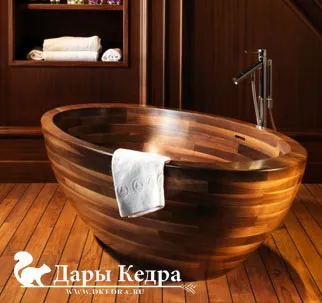 - Кедр не зря используют при судостроительстве. Древесина твёрдой породы отличается красивой структурой и благородным оттенком. Она не подвержена гниению, выдерживает долгое воздействие влаги и температуры. Практически не даёт усадки, не коробится и не трескается. Поэтому ванна при правильном уходе прослужит вам много лет.